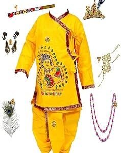 PK HUB Krishna Dress for Kids – Janmashtami Costume Set of 8 Items | Yellow Cotton Dhoti Kurta, Mukut, Mala, Earrings, Bajuband, Kamarband & Murli | Comfortable Traditional Outfit
