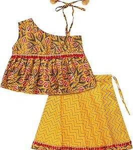 Baby Girl’s Cotton Jaipuri Print One Side Off Shoulder Top/Kurti And Printed Lehnga/ Yellow Skirt With Dori Closure Dress Clothing Set