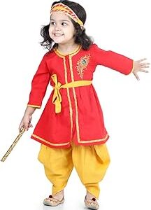 Ethnic Wear Cotton Radha Dress Top & Dhoti Set for Baby Girls, Front Open Embroidered Full Sleeve Top with Mukut Belt, Bansuri and Band