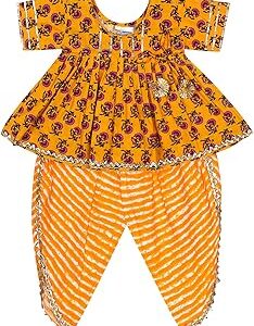Cotton Blend Baby Girl’s Jaipuri Print Frock Style Kurti With Frill Sleeves And Dhoti Style Salwar With Elastic Closure Ethnic Dress Clothing Set