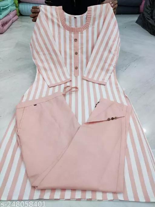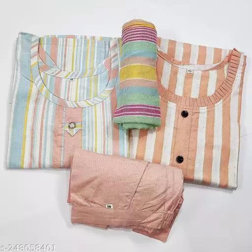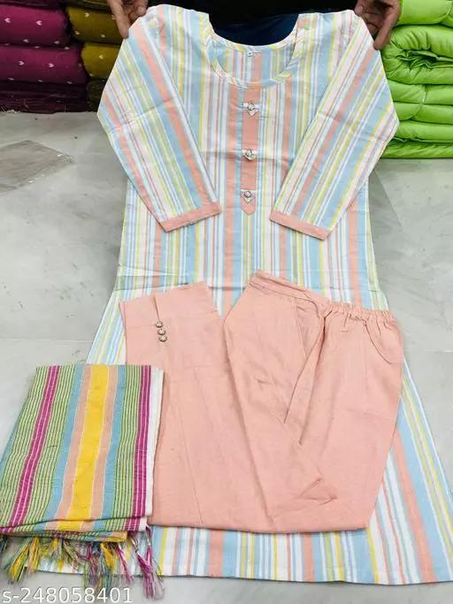 Multi Colour + lining frill design Women Cotton Kurtis Pant Dupatta Set